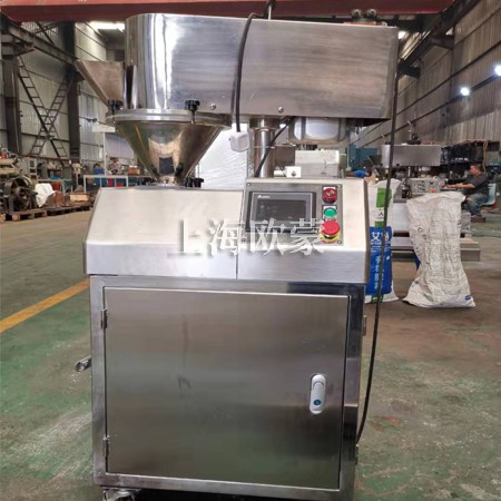 本機有送料機構(gòu)、壓片機構(gòu)、液壓機構(gòu)、機架和電氣控制等部件組成,送料,壓片、制粒均采用變頻無級調(diào)速,油泵壓力可調(diào),成品細度可以通過更換不同的篩網(wǎng)獲得。改進制粒轉(zhuǎn)籠,增加了顆粒的成品率。本機裝拆、清洗方便,與物料接觸部分皆為不銹鋼制作。產(chǎn)品符合GMP要求。物料由頂部送料漏斗加入,經(jīng)兩壓輪強制擠壓成片狀后進入下部制粒室,在制粒室中片狀物料被制粒刀片打碎,然后進入整粒室,直至顆粒小于或等于網(wǎng)孔徑,顆粒通過網(wǎng)篩到盛料托盤。所需要顆粒大小可以通過調(diào)整篩網(wǎng)大小來決定。